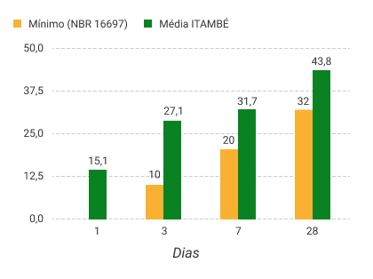 A Norma da ABNT não prevê a determinação da Resistência à Compressão a um dia para o CP IV-32 RS. A massa específica média do CP IV-32 RS ITAMBÉ é 2,78 g/cm³ (NBR 16605:2017). As datas do relatório se referem ao dia de expedição do cimento.
