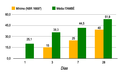 A Norma da ABNT não prevê a determinação da Resistência à Compressão a um dia para o CP II-F-40. A massa específica média do CP II-F-40 ITAMBÉ é 3,06 g/cm³ (NBR 16605:2017). As datas do relatório se referem ao dia de expedição do cimento.