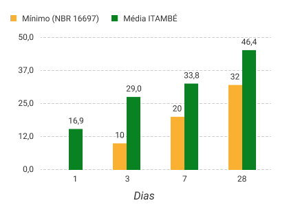 A Norma da ABNT não prevê a determinação da Resistência à Compressão a um dia para o CP IV-32 RS. A massa específica média do CP IV-32 RS ITAMBÉ é 2,78 g/cm³ (NBR 16605:2017). As datas do relatório se referem ao dia de expedição do cimento.