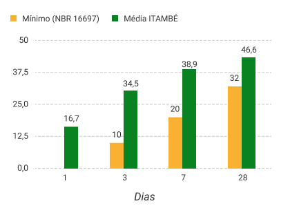 A Norma da ABNT não prevê a determinação da Resistência à Compressão a um dia para o CP II-F-32. A massa específica média do CP II-F-32 ITAMBÉ é 3,02 g/cm³ (NBR 16605:2017).As datas do relatório se referem ao dia de expedição do cimento.