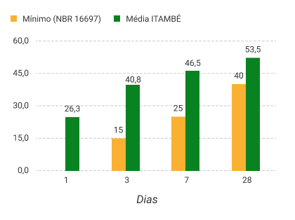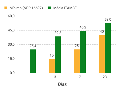 A Norma da ABNT não prevê a determinação da Resistência à Compressão a um dia para o CP II-F-40. A massa específica média do CP II-F-40 ITAMBÉ é 3,06 g/cm³ (NBR 16605:2017). As datas do relatório se referem ao dia de expedição do cimento.