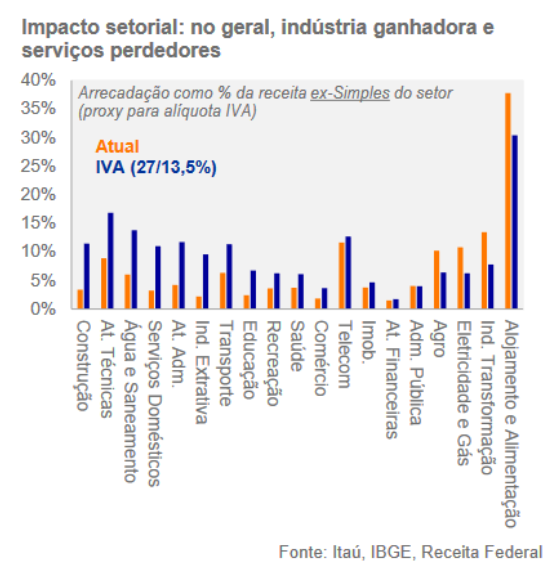 Um estudo feito pelo Itaú Unibanco prevê que o setor de construção deve sofrer alta relevante de alíquota – isto inclui a construção de edifícios (com regime específico, 40% do IVA setorial) e obras de infraestrutura (sem diferenciação); conforme mostra gráfico abaixo.